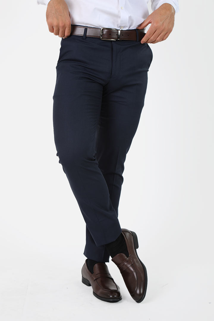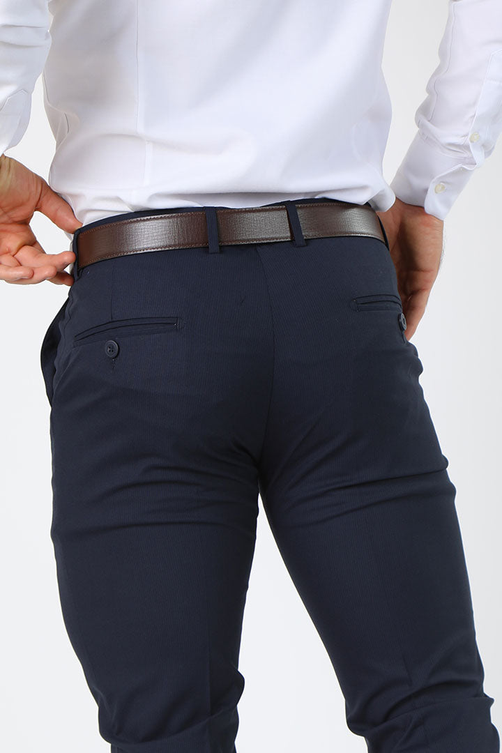 Elevate your formal wardrobe with these navy striped trousers from Francisco Tolli, tailored in a modern slim fit for a sharp, refined silhouette. Designed without pleats, the front stays sleek and clean, enhancing its contemporary appeal. The subtle stripe pattern adds texture and character, perfect for professionals who appreciate understated detail. Crafted from a TR blend with Lycra, these trousers provide a slight stretch, ensuring comfort and ease of movement through busy workdays or formal events. Pair them with a crisp white shirt or a structured blazer for a polished, confident look.