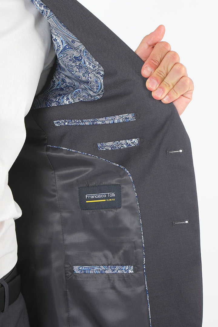 The charcoal slim fit formal suit from Francisco Tolli is a sophisticated option for any professional or formal setting. Made from a blend of 70% polyester, 28% viscose, and 2% spandex, this suit ensures a smooth, comfortable fit with just the right amount of stretch. The two-button front and dual vents at the back help create a sharp, modern silhouette. The deep charcoal color offers timeless elegance, making this suit a staple for any well-dressed individual.