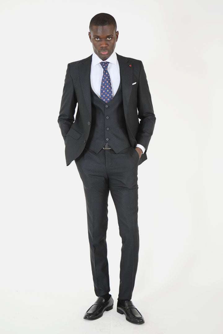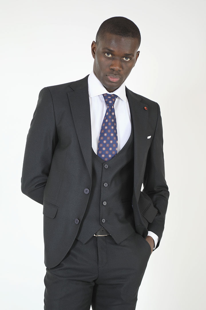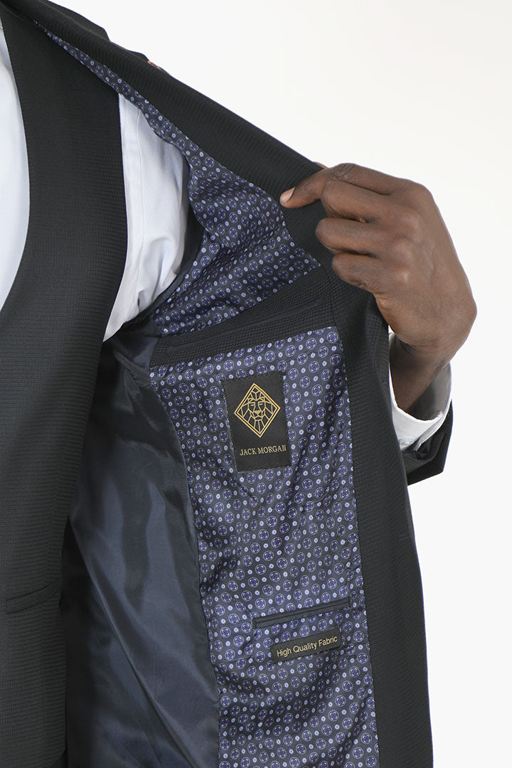This Jack Morgan suit is the perfect blend of modern style and timeless sophistication. Featuring a slim-fit cut with a two-button, two-vent design, this suit provides a sharp and tailored look. The checked pattern on the fabric adds a unique twist to the classic navy color, while the peak lapel gives it a bold, refined edge. Crafted from premium TR fabric, it's both durable and comfortable, making it ideal for formal events or occasions where you want to stand out. The matching vest completes the look for an extra touch of class and formality.