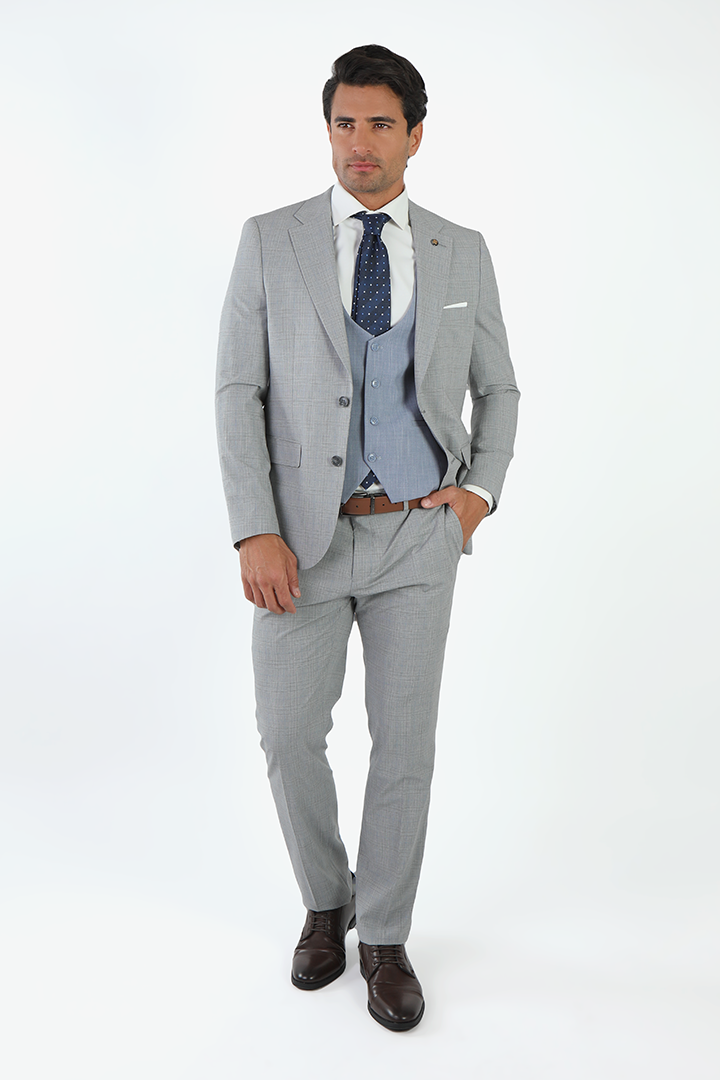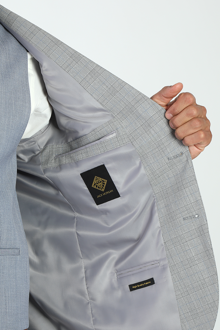 Elevate your formal look with the Jack Morgan slim-fit suit, designed with a sleek two-button, two-vent style and a sharp grey check pattern. Crafted for comfort and style, this suit is made from a blend of 66% polyester, 28% viscose, and 6% spandex, offering just the right amount of stretch for all-day wear. Perfect for both business and formal events, the matching vest completes the look, giving you a polished, modern appearance.
