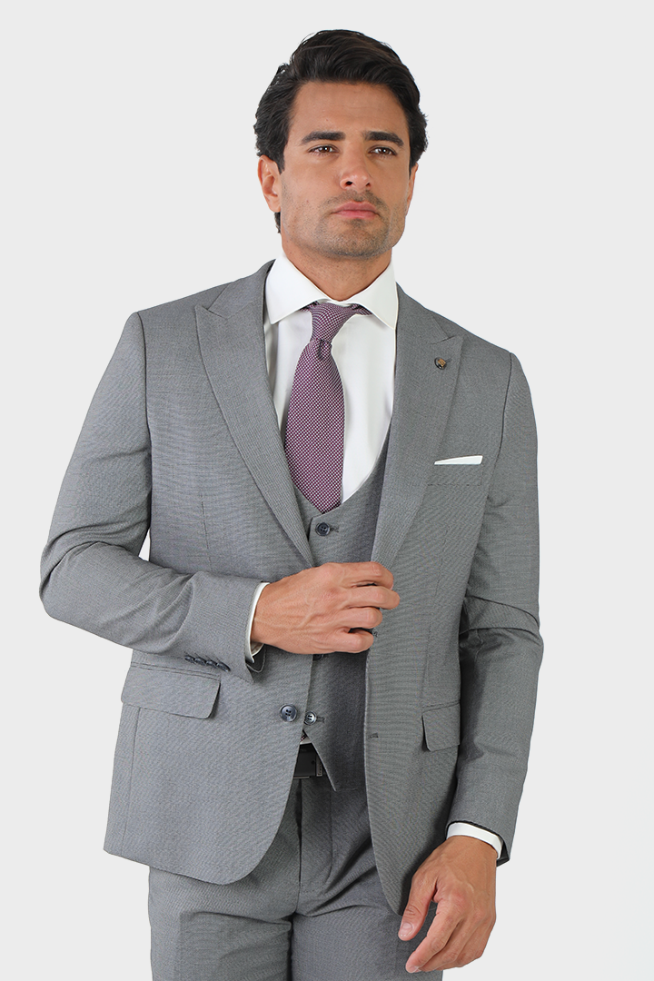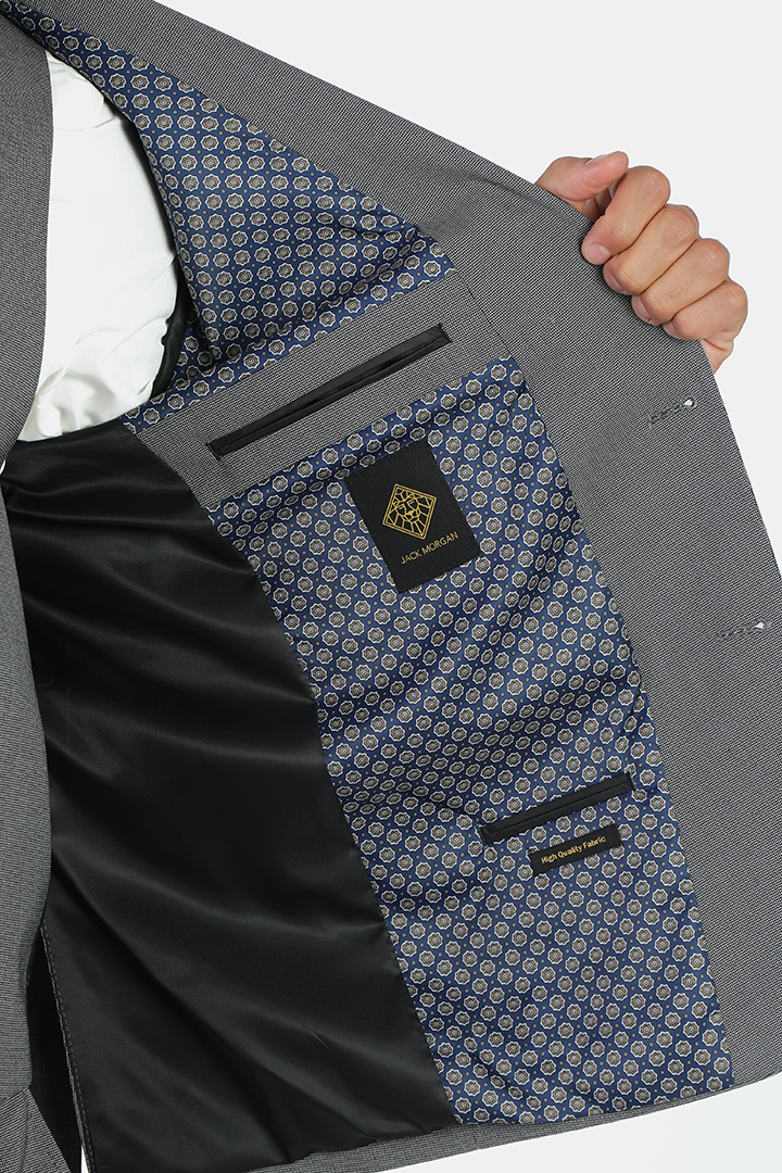 The Jack Morgan slim-fit grey suit in pin texture is designed for those who appreciate understated sophistication. Crafted from 81% polyester, 17% viscose, and 2% spandex, this suit offers both comfort and durability. The slim cut gives it a tailored, sharp look, while the pin-textured fabric adds subtle interest. With its two-button, two-vent design, this suit is perfect for those who want a polished, refined appearance at any formal occasion.