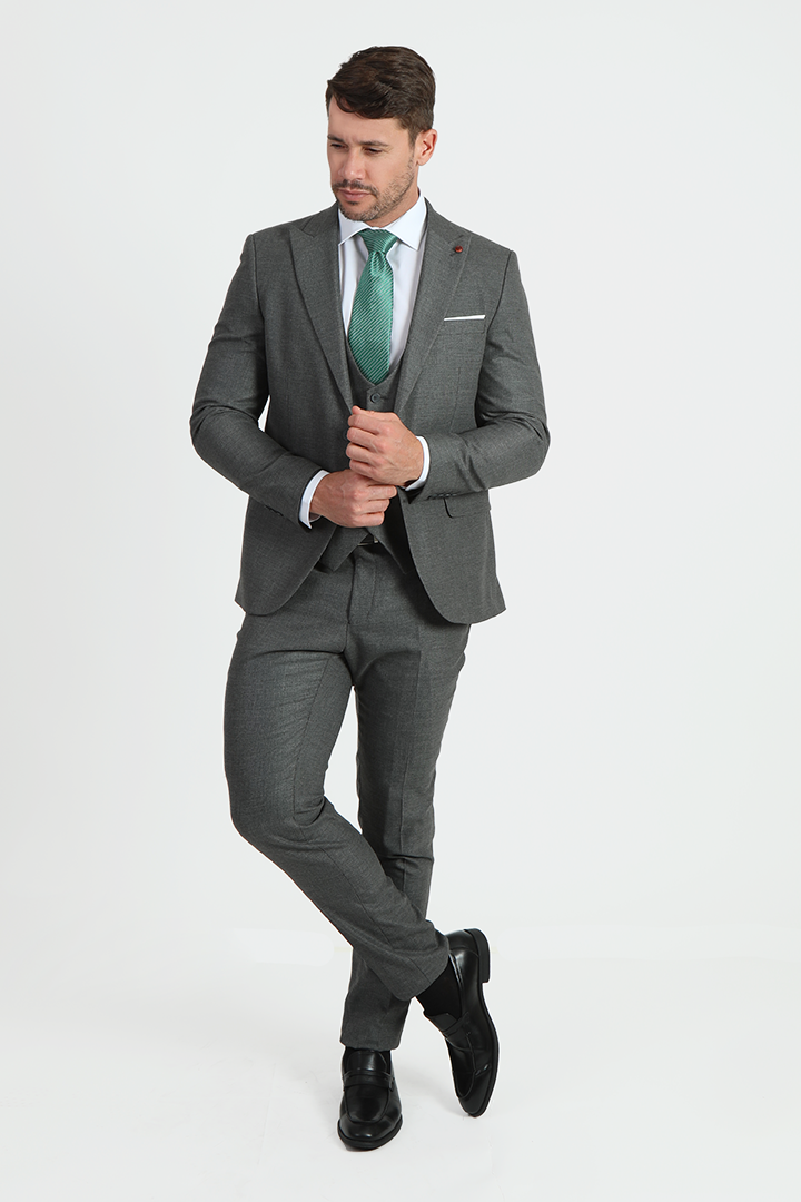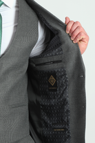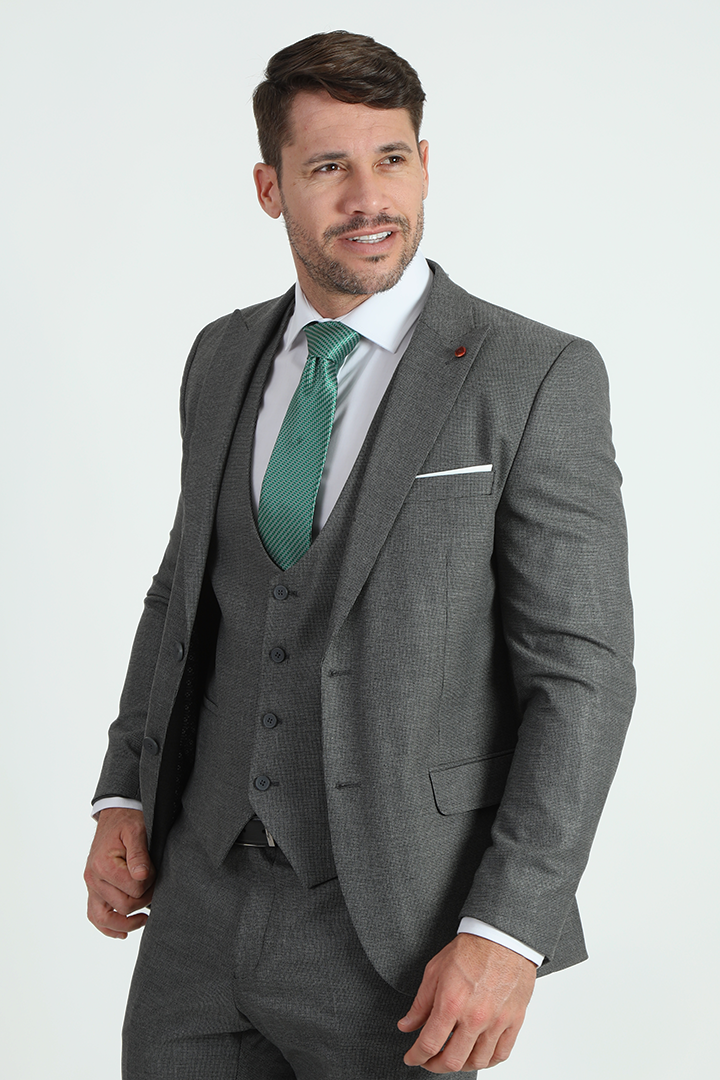 This unique Jack Morgan suit features a self-design fabric with a peak lapel, offering a standout look for those who want to add a bit of personality to their formal wardrobe. The slim fit, two-button, two-vent style is complemented by the matching vest for a complete, sophisticated ensemble. The high-quality TR fabric ensures durability and comfort, while the charcoal color and peak lapel bring a sharp, refined edge to the outfit.
