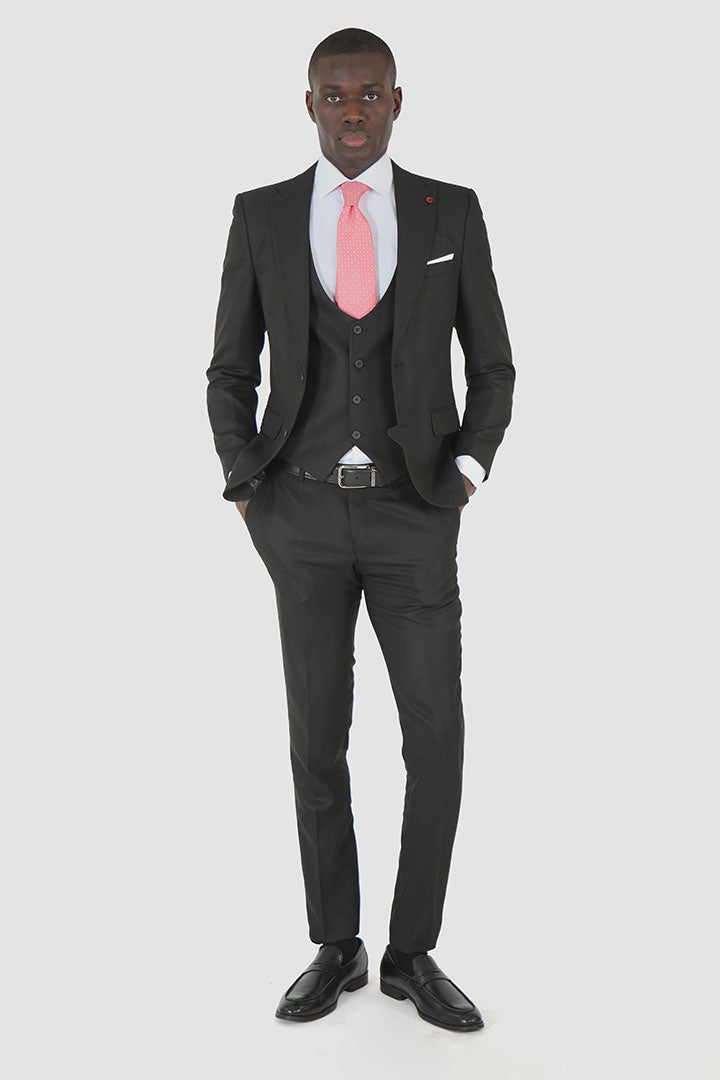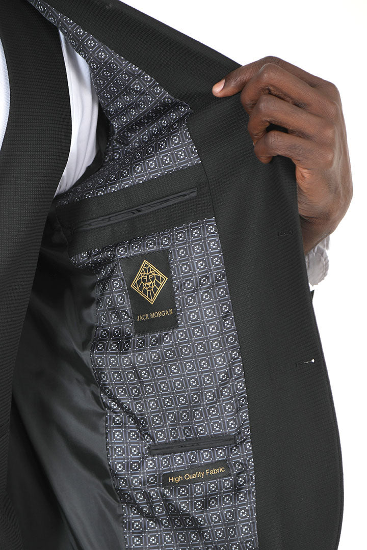 The Jack Morgan Formal Two Button Two Vent with Vest Slim Fit Checked Peak Lapel Suit is a striking choice for the modern gentleman. Crafted from high-quality TR fabric, this suit combines style and comfort, ensuring you look polished at any event. The slim fit design offers a contemporary silhouette, while the two-button closure and peak lapel add a touch of sophistication. With the added versatility of a matching vest, this suit is perfect for formal occasions, weddings, and business events. Available in classic black, the Jack Morgan suit provides a timeless elegance that makes a lasting impression. Elevate your formal attire with this stylish ensemble that embodies both confidence and refinement.
