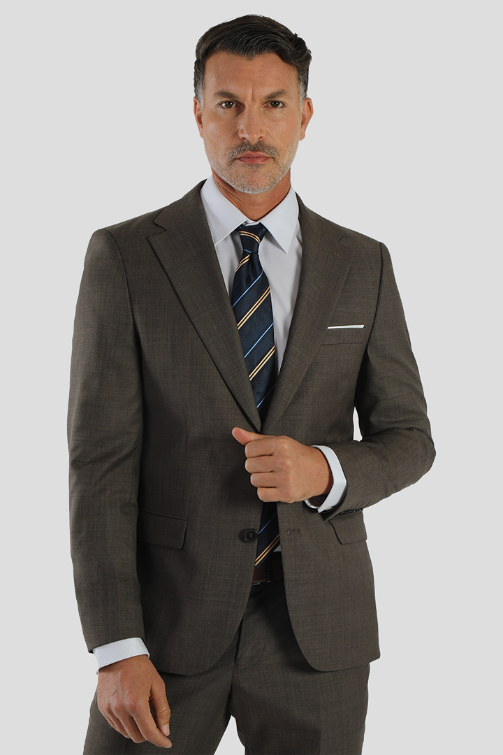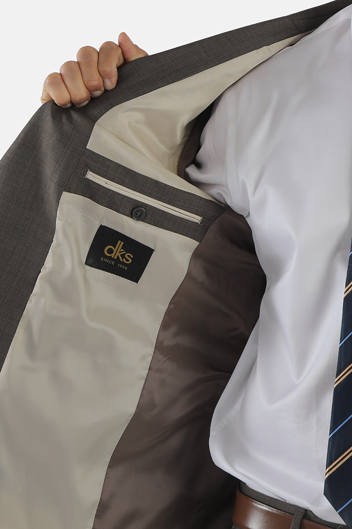 The DKS Formal Dark Brown Suit features a sophisticated fresco weave that provides breathability and texture, ideal for professional and elegant settings. Designed in a slim fit with a 2-button closure and double vents, this suit offers a sharp, modern silhouette with ease of movement. Made from a luxurious 55% wool and 45% polyester blend, it delivers both comfort and durability. The rich dark brown color adds a warm, distinguished edge to formalwear. Image available to highlight its refined craftsmanship and tailored finish.