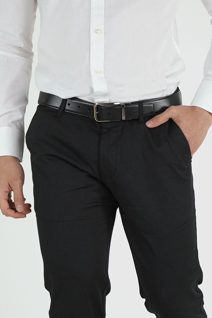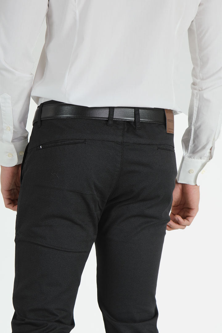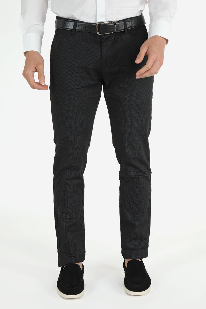 The Francisco Tolli Casual No Pleat, Self-Design, Black Slim Fit Trouser is tailored from cotton lycra for optimal comfort and flexibility. Perfect for versatile styling, it seamlessly combines sophistication with a modern edge.